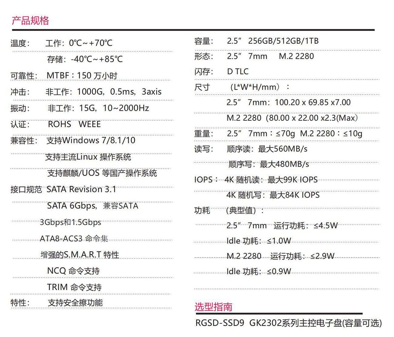 針對軍工系統特殊要求而設計;SSD-JB系列 加固電子盤;采用國內首款真正國 產的化的固態硬盤控制芯片(國科微GK2302系列主控), 搭載龍芯嵌入式 CPU IP核,為我國信息安全保駕護航,集成國密加解密算法,安全可信。芯片采用 高速SATA 6Gbps接口與主機通訊,讀寫速度達到500MB/s以上,可根據用戶需求 增加自毀、在結構和接口類型上,可根據用戶需求進行結構;容量和接口的定制設 計。