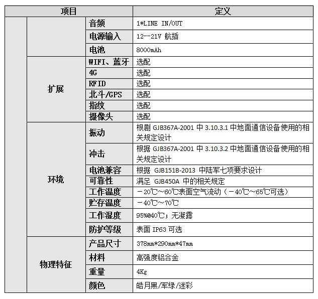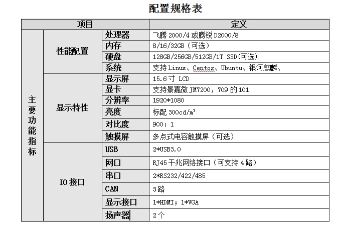 便攜式加固型計算機,處理器飛騰2000/4或騰銳D2000/8,內存8/16/32GB(可選),硬盤128GB/256GB/512GB/1T SSD(可選),系統支持Linux、Centos、Ubuntu、銀河麒麟。顯示屏15.6寸 LCD,顯卡支持景嘉微JM7200,709的101,分辨率1920*1080,亮度標配300cd/m2,對比度900:1,觸摸屏多點式電容觸摸屏(可選)。