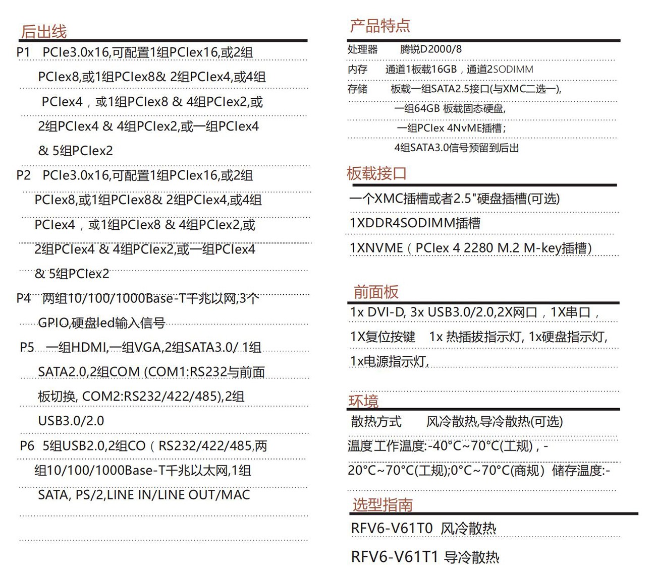 采用國產飛騰處理器FTD2000/8+ZX-200芯片 組按國產100%設計,VPX 結構兼容OpenVPX OpenVPX (VITA65),REDI (VITA48), 具 備 豐 富 的外圍接口;設計了高效的散熱系統(tǒng),可顯著提高處理器的浮點運算性能,廣泛應用于軍事,滿 足視頻采集與處理、雷達和聲吶等應用對高速數 據傳輸的要求。滿足無人機、裝甲車、水面艦艇 等軍工領域